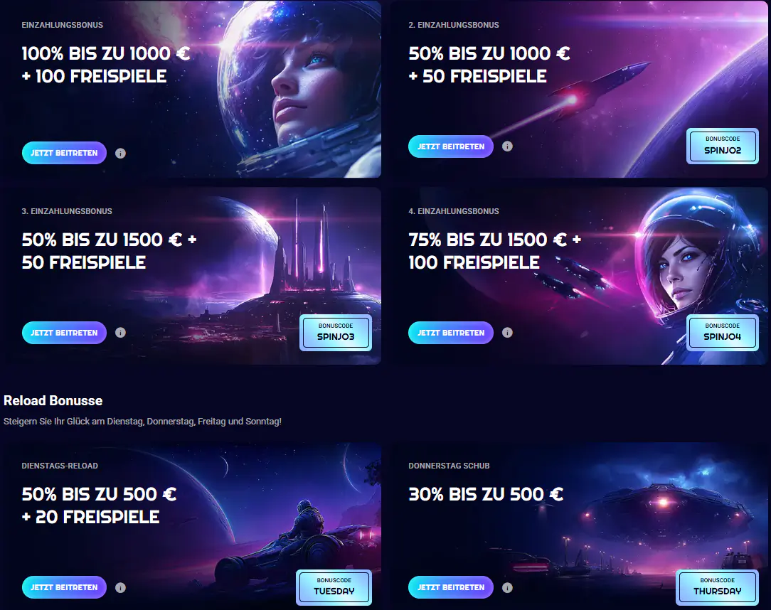 SpinJo zeichnet sich durch sein ungewöhnliches Weltraum-Design aus, das aufwendig gestaltete Raumschiffe und futuristische Astronauten umfasst. SpinJo Casino hat es sich zum Ziel gesetzt, ein fantastisches Online-Casino-Erlebnis zu bieten, mit über 6.000 Spielen von mehr als 100 erstklassigen Softwareanbietern und einem zuverlässigen 24/7-Kundenservice.